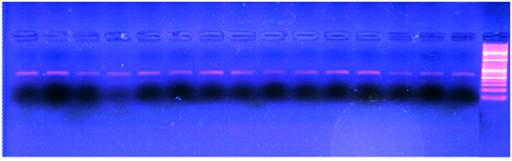 Tissue samples from the samples collected were taken out from the storage and thawed at room temperature. The samples were washed with PBS buffer, dried and approximately 25-50 mg of tissue material was homogenized in 200 µl of the buffer. To the homogenized sample, lysis buffer 500 µl was added and proceeded for DNA extraction. Further steps were carried out using the phenol: chloroform organic extraction method Taggart et al.5 The DNA was checked using 0.8% agarose gel running at 60 V for 45 min.