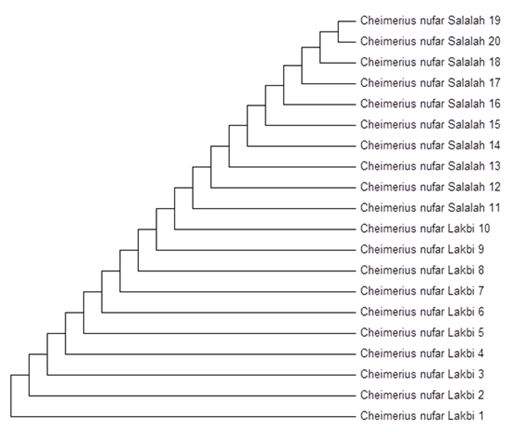 DNA was obtained from all the 30 samples and obtained DNA was used for PCR amplification COI gene. All the samples were positive for amplification of expected size (Figure 2). Species identification using BOLD database was shown in Table 1. Our results revealed that all the samples showed sequence similarity match with Cheimerius nufar with percent identity more than 98%. No case was observed where our query sequence matches with species under different species name. Further suggesting that all samples studied here indeed belonged to Cheimerius nufar. We also calculated interspecies nucleotide divergences of the samples studied here. The intraspecies nucleotide divergence calculated was 0%, thus suggesting that all samples studied here indeed belonged to same species. NJ clustering analysis also showed that all samples formed single monophyletic clade further suggesting that they belonged to same species (Figure 3). Thus our analysis using similarity search and NJ clustering analysis showed that samples collected from two localities of Oman indeed belonged to Cheimerius nufar. This is the first study from Oman that showed utility of DNA barcoding for species identification of commercially important species, C. nufar. We believe that efforts should be made to collect samples of C. nufar from different localities of Oman to establish the intraspecies divergence between them. And once such database is ready it would be easier for anybody to identify this species if sold under different species name.