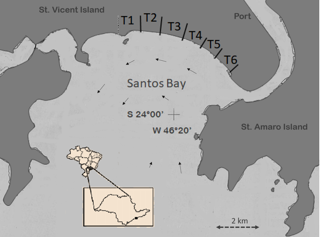 Figure 1 Location map of the study area. The arrows show the predominant currents in Santos Bay. The transects (T1 to T6) were considered for the counting and biometrics of sand dollars that arrived on the superior coast of Santos Beach (Brazil).