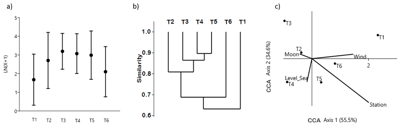 Figure 2 (a) Average number (with standard deviations) of individuals registered in transects T1 to T6 at Santos beach; (b) Transect cluster, using a connection by the UPGMA method, and Bray-Curtis similarity (CCC= 0.93); (c) Canonical Correspondence Analysis between abiotic and biotic variables of the samples.