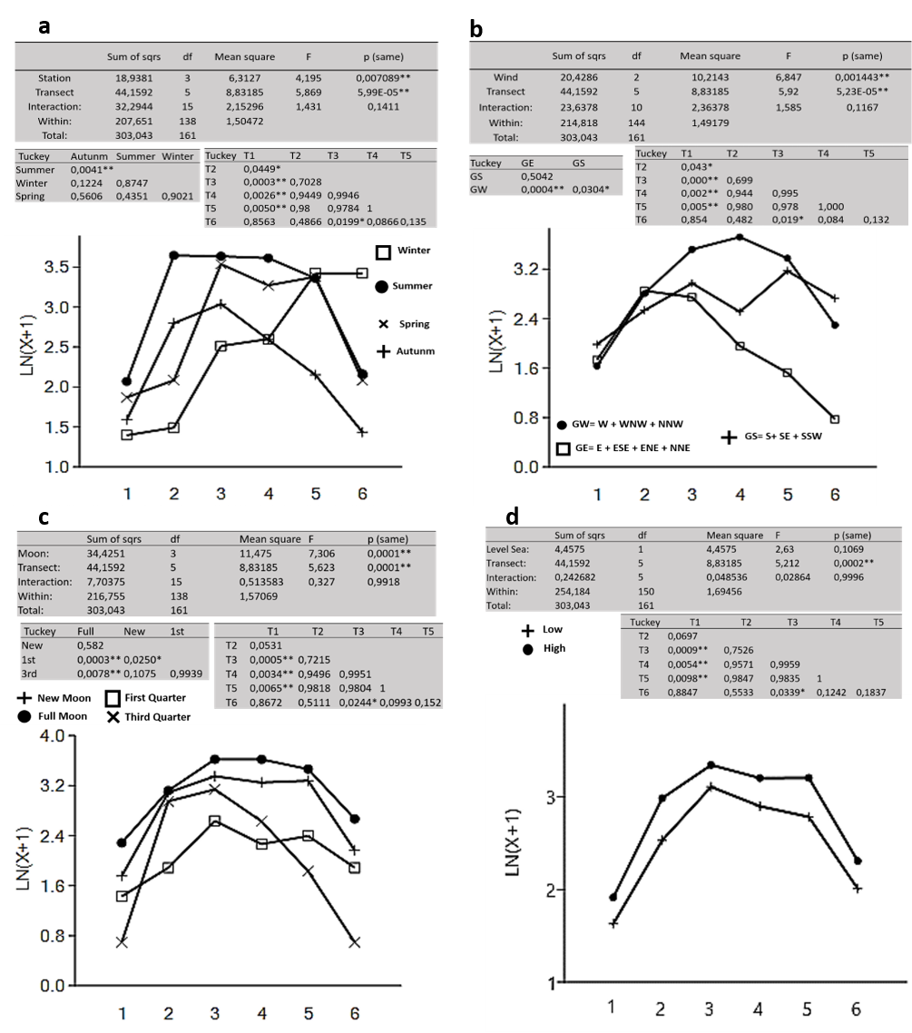 Figure 3 shows the results of the two-way analysis of variances and the Tukey tests for factors that showed significant differences and, Table 2 shows the Tukey test results for the sample means. We verified the significant influence of the season, the direction of the prevailing winds, and the moon phases (p<0.01). The interactions between the variables were not significant. Figure 3a showed that during the summer, the number was higher in transects T1a T4, while in winter, we registered a higher number of individuals in transect T6. Summer and autumn showed significant differences using the Tukey test. The samples obtained during the East quadrant (GE) winds showed more individuals in transects T2 and T3, while in the west (GW) and south (GS) winds, we verified a higher proportion of cookies between transects T5 and T6 (Figure 3b). A highlight for West winds (GW) that showed significant differences. We recorded higher numbers of individuals in the moons of syzygy (New and Full Moon) than the quadrature phases (First and Third quarter of the moon). The full moon results were significantly different from those found on the 1st and 3rd quarter moons (Figure 3c). Those obtained in the new moon were different only from the 1st quarter. The height of the sea level, on the other hand, had no significant effect on the distribution of individuals along the beach (Figure 3d).