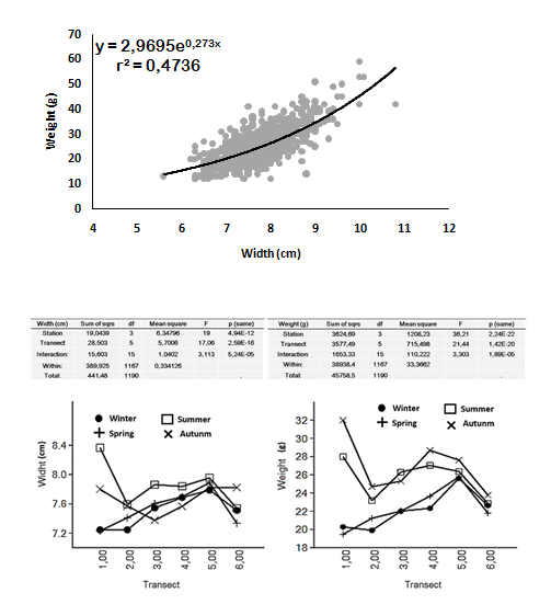 We measured the width and weight of 1192 sand dollars, whose weight-length regression equation (Figure 4). The animals' size ranged from 5.4 to 10.8 cm in carapace width, while the weight varied from 7, 9 to 59g. Still in Figure 4, in its lower part, it details the results of the analysis of variances and Tukey test with significant differences (p<0.01) of the seasons and the stretches of the beaches (Figure 4 below). The individuals measured in transects T1 to T4 were larger and heavier, especially in summer and autumn, while in sections T5 and T6, such differences were less relevant.