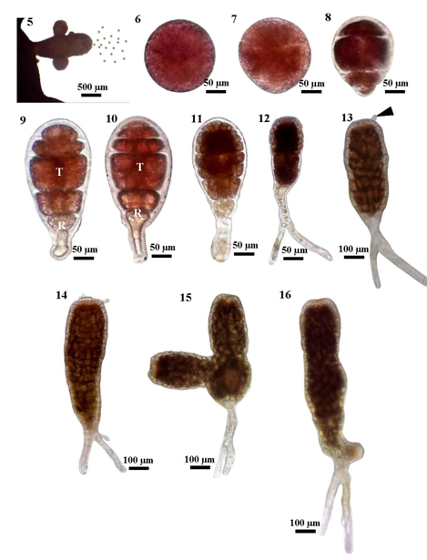 Tetraspores from Tetrasporangia stichidia. (6) Released tetraspores, (7-8) Tetrasporeling with two to three unequa-celled stages with developed rhizoids after four to seven days. 13) Tetrasporeling produces trichoblast (arrowhead) after eleven days.( 14,15) Tetrasporeling produces small lateral branchlet after twenty days. 16) Tetrasporeling shows developed rhizoids after thirty days.