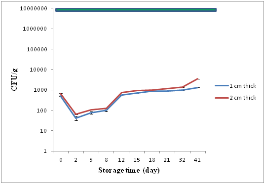 Figure 1 Mean TPC (± SEM) for 1 and 2 cm thick fillets sampled on 0, 2, 8, 15, 21, 32 and 41 days, ICMSF (1986) standard of 107CFU/g is indicated by the green line.