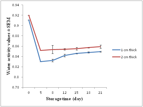 Water activity (aw) values were measured on days 0, 5, 8, 12, 15, 18 and 21 and are presented in (Figure 2). The values of aw on day 0 (raw fillets) were 0.911± 0.002 for 1 cm thick fillets and 0.92 ± 0.0021 for 2 cm thick fillets. On day 5 after treatment aw values for both treatments had decreased to a mean of 0.83 and 0.85 for the1 cm thick and 2 cm thick fillets. Water activity subsequently increased for the rest of the experiment, reaching 0.849 ± 0.0015 for 1 cm thick and 0.859 ± 0.0010 for 2 cm thick on day 21.