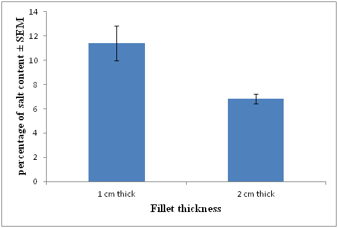 Figure 3 Mean (n= 3) salt content (± SEM) of 1 and 2 cm thick fillets sampled on day 2 of the experiment.