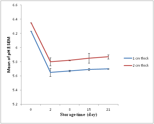 pH was measured on days 0, 2, 8, 15 and 21 of the experiment. The day 0 pH of raw fillets before curing was 6.23 ± 0.005 for 1 cm thick fillets and 6.35 ± 0.06 for 2 cm thick fillets. On day 2 pH values had decreased for both treatments reaching 5.65 ± 0.055 and 5.83 ± 0.055 for 1 and 2 cm thick fillets respectively. From day 2 until day 21 pH values increased slightly and reached 5.7 ± 0.005 for 1 cm thick and 5.87 ± 0.03 for 2 cm thick at the conclusion of the experiment. There was a significant difference in pH between the 2 different thicknesses of gravlax fillets (Figure 4).