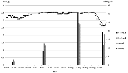 The above-described experiments were set up under conditions of a constant water temperature of 18±1.0°С in tanks. However, the water salinity measurements conducted in the course of the experiment showed some seasonal fluctuations in this parameter (Figure 1).