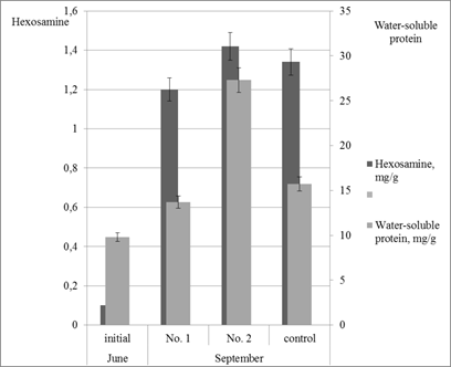 The data in Figure 2 show that all three types of experimental feeds caused a 1.4–2.8-fold increase in the level of water-soluble proteins in tissues of the juvenile sea cucumbers. In this case, the most pronounced effect of increase in water-soluble protein content was recorded for the feed with a high DNA content (no. 2). The difference in efficiency between the feeds with different DNA levels was 2-fold for this parameter. At the same time, the efficiency of the feed with a DNA content of 5g/kg was by 70% higher than that of the control feed. Hexosamines are monomers of glycosaminoglycans which are the main component of the extracellular matrix contributing to the formation of the dense structure of muscular sac in sea cucumbers.