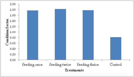 The condition factor was higher in the feeding two times a day at 1.82, feeding three times a day had 1.78, feeding once a day had 1.77 and control (no feeding) having a condition factor of 0.82 (Figure 1).
