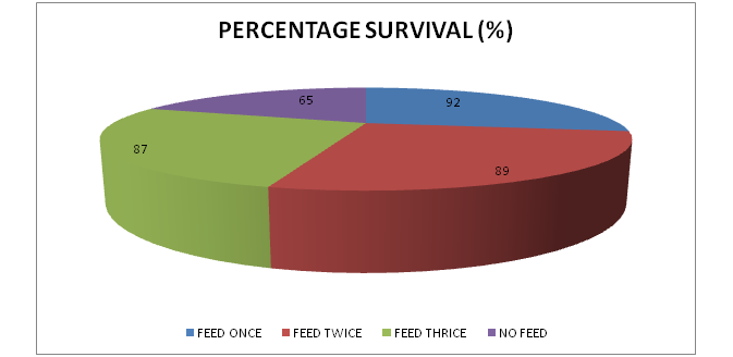 Survival rate of the Nile tilapia fingerlings were calculate and feeding twice had the highest survival at 92%, feeding once at 89%, feeding three times at 87% and least in control at 65% (Table 3)(Figure 2).13,14
