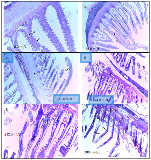 Figure 2 showing Sections of the gills Clariasgarieoinus exposed to Gmelinaarboreafruit juice: (a) there are prominent gill arches with distinct primary and secondary lamellae, the secondary lamellae have vascular middle core with epithelial cells on both side. (b) has gill arch (A) with distinct primary lamellae(B) The epithelium is mildly ulcerated and there are prominent congested blood vessels and proliferating pillar cells.(c) erosion of the secondary epithelial cells. (d) Erosion of the epithelial cells (e) There are congested blood vessels and proliferating pillar cells with epithelium grossly damaged (f) erosion leading to complete breakage of the filaments.