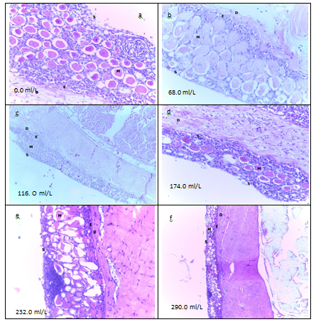 Figure 4 is made of sections of the skin of Clariasgariepinus exposed to Gmelina arborea fruit juice (a). The mucus-secreting cells are prominent and scanty goblets cells found, lymphocytes and macrophages are seen. The dermis is dense consists of bundles of collagenous tissues, scattered fibroblasts, and few pigment cells. S-superficial mucin, M-mucus cells, E- sub-epidermal layer, D- Dermis. (b) vaculations in the dermal region. (c)The proximal epidermal cells have vacuolated cytoplasm. The mucus-secreting cells are prominent but few and scanty goblets, lymphocytes and macrophages are seen. (d)The mucus secreting cells are abundant and prominent. (e)The dermis is dense and comprised of fibro-collagenous fibres, fibroblasts and scanty inflammatory cells. (f) The mucus-secreting cells are prominent and abundant and severe inflammatory infiltrates mainly lymphocytes and sprinkling of inflammatory cells.