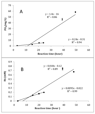 Enzyme activity was determined by concentrations of inorganic phosphate (PO4) and hypoxanthine (Hx). Bars denote standard deviation of the mean (n = 3). Mean relative activity differed significantly (P< 0.05) each hour. Equations on the left show the linear approximation and correlation coefficients for the entire reaction time (0–48 h); equations on the right are for the reaction from zero to 24 h.