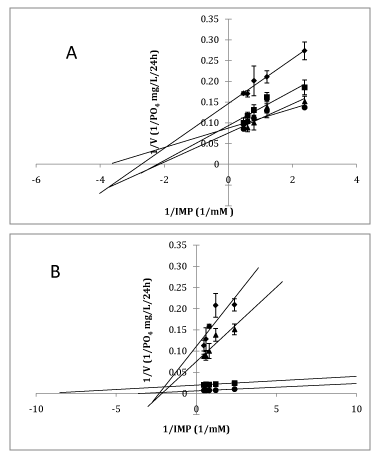 We generated Lineweaver-Burk plots that showed the reciprocal substrate concentrations and reaction rates to investigate the inhibition of IMPase and HxRase by different final salt concentrations (Figure 2 and 3). The reaction rates increased when the concentrations of substrate increased (P< 0.05), as seen in the Km and Vmax values (Table 2).