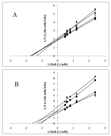 Figure 3 Lineweaver–Burk plots of HxRase activity in Pacific cod muscle in the presence of NaCl (A) and MgCl2 (B). Bars denote standard deviation of the mean (n = 3). (HxR) shows the concentration of inosine (HxR) (mM). •: 0.42% NaCl or MgCl2; ■: 0.83% NaCl or MgCl2; ♦: 1.7% NaCl and MgCl2; ▲: No salts