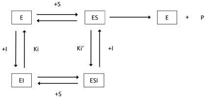 Figure 4 Model of the inhibition on enzyme. E: enzyme; S: substrate; I: inhibitor; P: product; in this study, E shows IMPase or HxRase, S shows IMP or HxR, I shows NaCl, and P shows PO4 or Hx.
