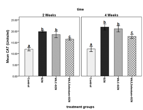 Figure 2 Changes in catalase (CAT) activity levels in serum samples of fish exposed to diazinon (0.1 mg/L) and treated with either vitamin E, selenium or vitamin C compared to the control group after two and four weeks.