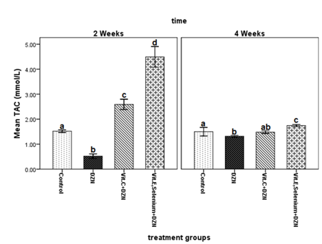 Figure 3 Changes in total antioxidant (TAC) activity levels in serum samples of fish exposed to diazinon (0.1 mg/L) and treated with either vitamin E, selenium or vitamin C compared to the control group after two and four weeks.