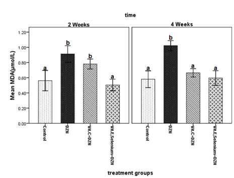 Figure 4 Changes in malondialdehyde (MDA) activity levels in serum samples of fish exposed to diazinon (0.1 mg/L) and treated with either vitamin E, selenium or vitamin C compared to the control group after two and four weeks.