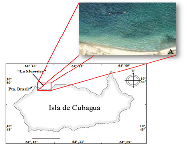 Cubagua Island (Figure 1), located 10 km from the town of Punta de Piedras (Margarita Island), was chosen as the breeding site. It is situated between 10º 47' and 10º 51' north latitude and between 64º 8' and 64º 14' west longitude in the Caribbean Sea. The island covers an area of 23 km2. Its coastline features rocky ecosystems, sandy beaches, seagrass meadows, and coral patches.12