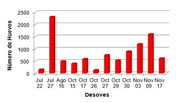 Continuous spawns were recorded in 3 pairs of P. marmoreus, totaling 9,074 eggs obtained in captivity from a total of 12 spawns, with a range of 134 to 2,315 eggs per spawn, occurring from July to November (Figure 3).