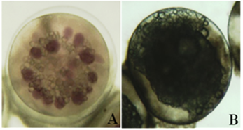 Figure 4 Spawned eggs of Parablennius marmoreus. A) Fertilized egg without division B) Unfertilized egg.