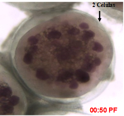 The first division (formation of the two initial cells) was observed at 0 hours and 50 minutes post-fertilization (PF). The animal pole was differentiated. The egg coloration remained the same as in the previous stage (Figure 5). The average diameter of the yolk was 0.52±0.04 mm. The average volume of the yolk was 0.08 mm3. The average width of the perivitelline space was 0.11±0.04 mm (N=3).