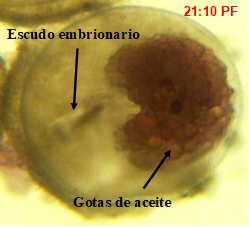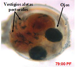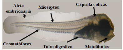 Photographs were taken during embryonic development using a MOTIC MOTICAM 2300 digital camera with a resolution of 3.0 megapixels, adapted to the aforementioned microscope. The camera's digital program was used to calibrate the equipment with the microscope's objectives (following the instructions in the camera's manual) in order to measure the following characteristics, as established by Ortiz et al.,15 egg width (AH), egg height (HH), vitellus diameter (DV), vitellus height (HV), perivitelline space (EPV), oil droplet diameter (DGA), notochord length (LN), post-orbital distance (DPO), rostrum length (LR), eye diameter (DO), gut tube length (LTD), mouth length (LB). The appearance and development of optic and otic capsules, heart, Kupffer's vesicle, pectoral fins, and pigment cells were also observed (Figure 2).