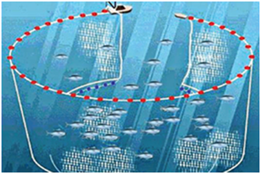 The aim of Purse-Seine ships for tuna fishing is keeping the tuna alive. The process of transferring the tuna from the fishing net, to the towing cages then to the farming site must be done by specialists. The cage has to be towed in a certain way while the ropes should fixed in a way to avoid cracking of pipes and allowing the escape of the fish and the speed of ship towing the cages should not exceed 4 nots/hour throughout the whole journey (Figure 4 & 5).