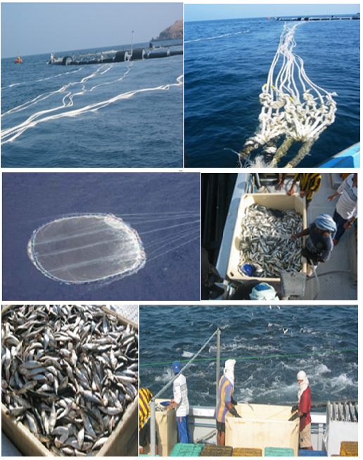 When tuna fattening was practiced in the Sultanate of Oman, fishing was practiced in areas around 50-70 kilometers away from farming sits using Purse-Seine ships where the nets were kept open to avoid killing the fish before transferring under water to the towing cages and then to the fattening cages.