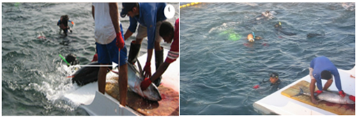 Harvesting process is a delicate activity, should be very well organized and requires accuracy and speed at work and relies on the use of special collection net (Figure 7) to collects almost the required number and detain it in the cage, followed by professional divers chasing the fish and getting hold of them , this process is a difficult process and needs effort and concentration; followed by the lifting of the fish from the water onto a smooth floating panel to reduce friction with the fish’s body.