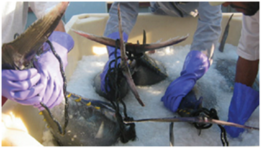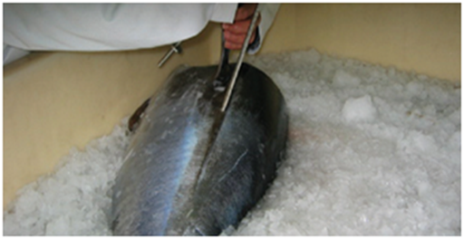 After lifting the tuna, the first step to kill the fish is by putting special steel nail in the brain of the fish to reduce stress and avoid burning of the meat. On the boat the second step is cutting the head using an electrics a wand insert of steel wire in the spinal cord in order to ensure the full death of the fish. Fish are then placed in ice water to ensure cooling of the meat and preserving meat quality. The last stage is to send the fish to the factory for processing and exportation (Figure 7-10).