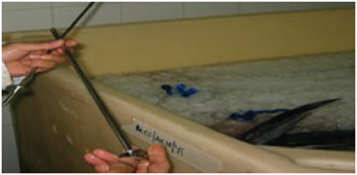 Figure 12.4 The process of taking a sample of fish flesh using as ample tube, the Sampling tube is a vacuum steel tube that enters the fish's body and Pulls the meat from the inside.