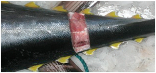 Figure 14 The other method of sampling is to cut a section close to the tail region, and to take for examination to determine the percentage off at in the meat. The percentage off at in the meat determines the price of exportation to the Japanese market therefore the stage of checking the percentage of at in the meat is an important stage of marketing the farmed tuna.