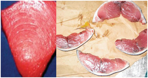 Figure 15 Shows the form of tuna meat fattened in cages that were fed foods High in the percentage of oils please observe gloss meat at the high proportion of oils.