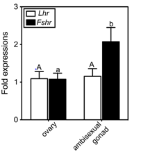 Figure 1 Real-time quantitative RT-PCR analysis of gonadotropin receptor mRNA levels in the ovary (female) and the ambisexual gonad (male) of the clownfish, A. clarkii. The values were calibrated with an internal control (ef1a).