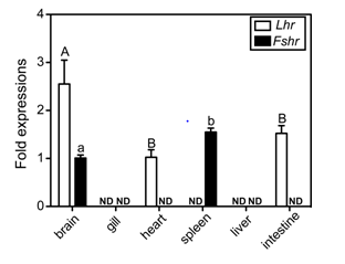 Figure 2 Tissue distributions of clownfish GtHr transcripts. The values were calibrated with an internal control (ef1a) and are expressed as fold changes in abundance relative to transcript levels in the brain (Fshr) and heart (Lhr), which were the lowest detectable expression levels, respectively. Data shown are ± SEM. ND indicates not detected.