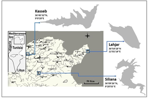 Lahjar Reservoir is a hill lake located in the governorate of Nabeul (36°54'18 "N, 11°01'14 "E) and it is used for irrigation. Fishery resources in this dam reservoir are exploited by the promoter.16,17 Kasseb Reservoir spreads about 20km west of the town of Beja (36°45'32" N, 9°0'20" E) and it is operated by independent fishermen.15–17 Siliana Reservoir is situated in the north of Siliana city (36°09'26''N, 9°20'55" E) and is used for irrigation. This dam is operated by a fishing development group composed of four fishermen (Figure 1).15–17