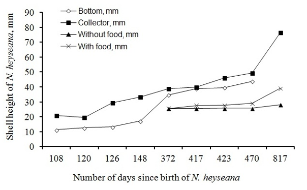 With a four-year content with an excess of food, the number of deposited capsules increased to 610 pieces, and the number of emerging larvae increased to 19.8 + 9.7 specimens. They came out of the clutches with a small supply of yolk and went without food for a while. However, on the fourth day, the shells of an almost one-year-old M. trossulus were drilled and one individual was eaten in four days. Cannibalism was observed in cylinders without food, and up to 5 through holes in the shell were found in the dead N. heyseana and Epheria turrita (E. turrita). In a cylinder, thanks to the abundance of food N. heyseana grew intensively and in a month overtook the one-year-old E. turrita in shell height (3.5 and 3.0 mm, respectively).