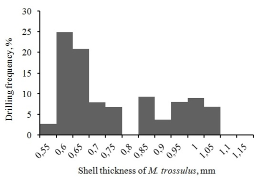 At the ventral edge of the shell at five drilling points, the total thickness of the flaps was 4 mm, and at the dorsal edge – 3.65 mm. Incomplete holes (0.33%) were found in 7 M. trossulus specimens out of 2,140 and they were located above the thick part of the shell. With a similar shell thickness and hole diameter, shells with incomplete holes were larger (L = 26.1+ 5.6 mm and L = 21.8+0.2 mm, respectively).