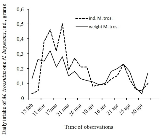 With the onset of spring, the amount and total weight of M. trossulus consumed increased. By March 19, they reached their maximum values, and then sharply decreased (Figure 14). At that time, N. heyseana formed groups of 5-6 individuals and on M. trossulus hunted only single individuals. Some N. heyseana deposited capsules on the walls of the aquarium, and by the end of April, the feeding intensity of N. heyseana increased (Figure 14).
