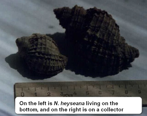 In the littoral of the middle part of the Primorsky Territory (whale Inlet) M. trossulus is easy to find and predatory sea stars A. amurensis and Distolasterias nippon do not occur there. This is probably why M. trossulus occurs more frequently under algal plantations and remains alive longer. Due to the abundance of food and lower temperatures, which lengthen the life span, N. heyseana reaches a record shell height of 78mm there and 77mm in the Minonosok Inlet collectors. The calculation of the eaten mass of M. trossulus and the weight gain of N. heyseana on artificial substrates allowed us to establish that the digestibility of its food in the collector - cage is 63.6%, and in the cage with a scallop - 50.3%. In the collector, to increase the diameter of the "trunk" by 0.1 mm, the N. heyseana had to eat an average of 3 M. trossulus specimens.