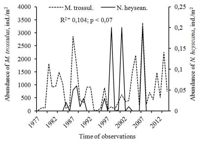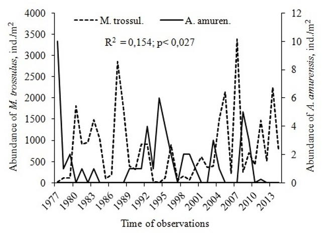where x is the abundance of M. trossulus (ind./m2 of collector), and Y is the abundance of A. amurensis (ind. /m2 of collector). After abandoning the cultivation of M. trossulus in the Minonosok Inlet in 1989, the abundance of M. trossulus began to decrease, and already in 1991 A. amurensis began to occur 4 times more often, and N. heyseana disappeared and between them there is an opposite dynamics of the population size (Figure 4).