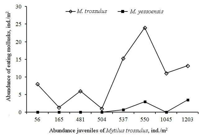 With an increase in the volume of cultivation in the Minonosok Inlet M. yessoensis and M. trossulus, the abundance of N. heyseana on the bottom increased to 2,200 ind./m2, and the biomass to 6.9 kg/m2.22 The cultivation of M. trossulus contributes to the colonization of coastal communities by its larvae, which increases the fertility of N. heyseana, because an abundance of food provides high energy reserves.23 The number of predators is proportional to the density of the prey settlement and the area of its accumulation,9 and the dynamics of the number of consumers is strictly related to the limiting parameter - food.24