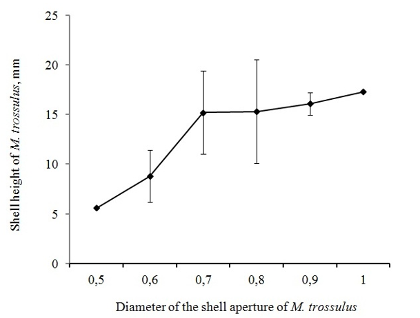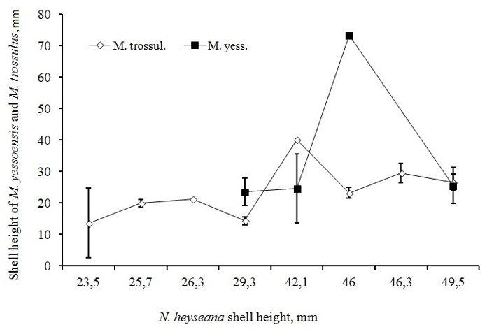 In scallop collectors, the number of M. trossulus is greater than on the bottom, so after 2.5 years of life, the shell height of N. heyseana was almost twice as high as that of individuals living on the bottom (Figure 11).