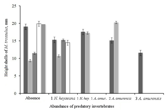 A comparison of the contents of collectors with and without N. heyseana showed that in collectors with a predator, as a rule, there were two more species of bivalves. These are mainly Ch. farreri and M. senchousia. In collectors without N. heyseana, the full death of M. yessoensis and Ch. farreri was sometimes observed already in late summer.