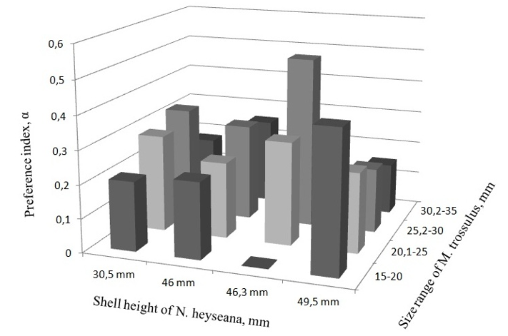 For four different-sized individuals of N. heyseana the preference histogram was constructed for four different-sized groups of M. trossulus. An idea of diet selectivity was obtained by comparing the numerical structure of living and dead M. trossulus.