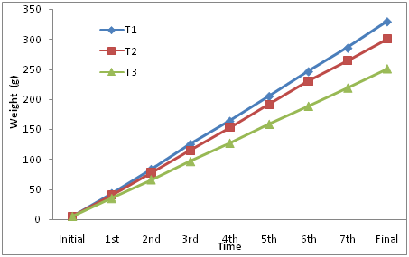 There was no significant (p˂0.01) difference in initial weight of fish in different treatment. The weight gain of fish was 323.68±2.05, 294.55±0.87 and 244.72±2.33 g for T1, T2 and T3, respectively. The significantly (P˂0.01) highest weight gain (323.68 g) was found in fish having feeding frequency four times and lowest weight gain (244.72 g) was found in fish having feeding frequency two times.