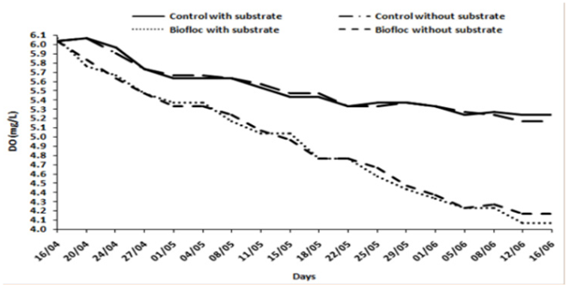 Dissolved oxygen (DO): DO concentrations in the control tanks were higher than the biofloc treatment tanks throughout the culture period (Figure 1). The values decreased gradually from 6.07 mg/L until 5.2 and 4.07 mg/L in the control and biofloc tanks, respectively. Variations in DO concentrations between the two treatments were significantly different (P <0.001). However, no significant difference was recorded in the treatments with the presence or absence of substrate (P <0.070).